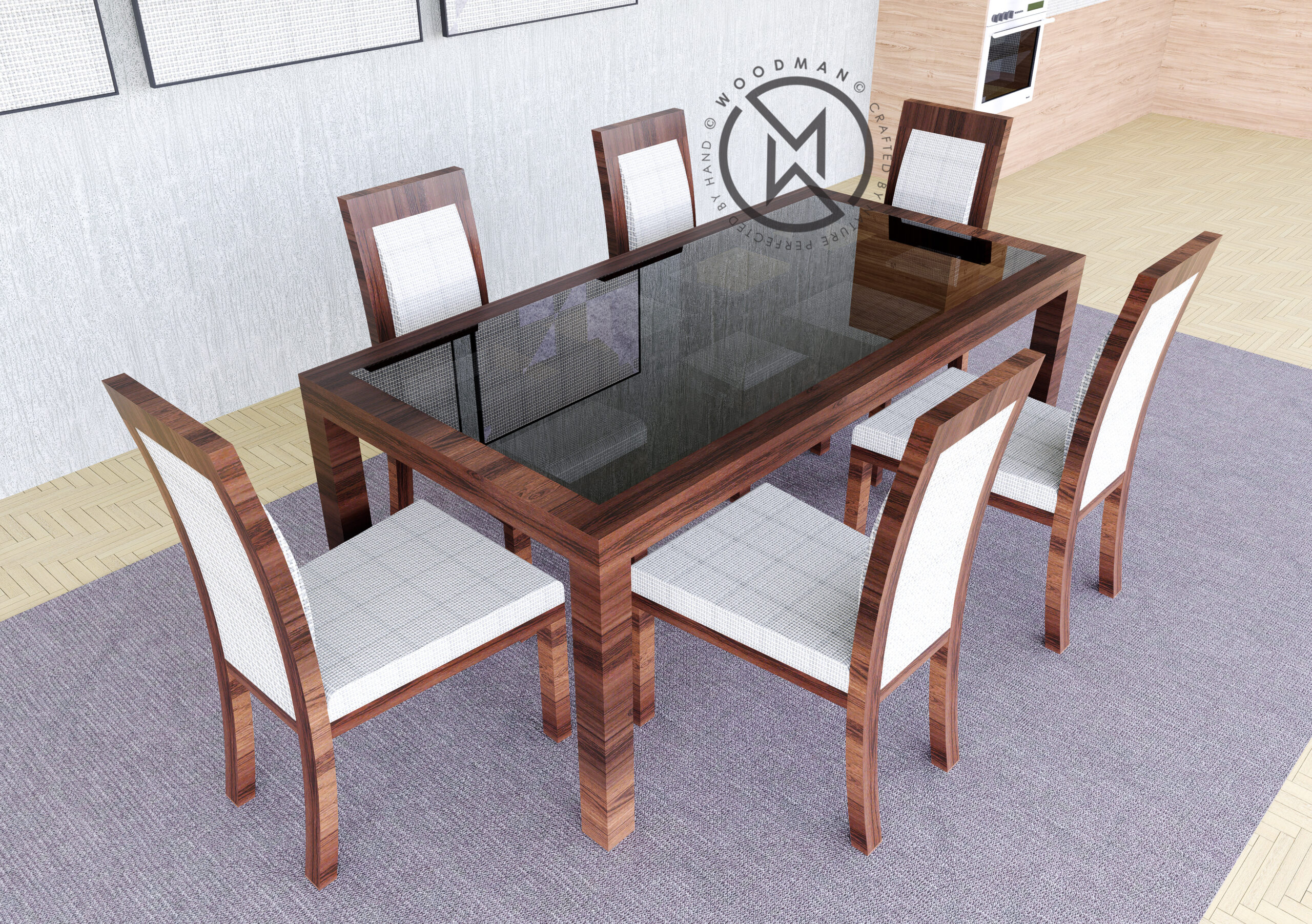 Upgrade your dining space with this elegant 6-seater dining table set, crafted from high-quality engineered wood and finished with a sleek black tempered glass top. The rich wood tone complements the clean lines, while the contrast of light fabric upholstery adds a touch of modern sophistication.