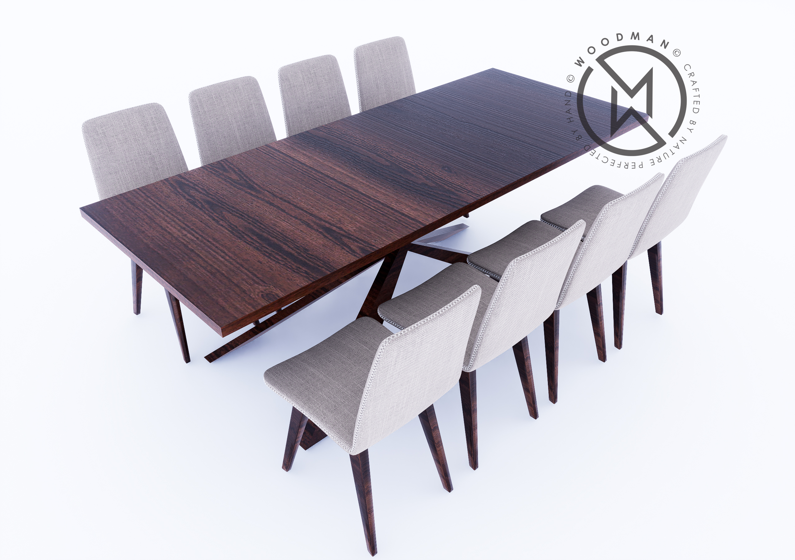 Experience the essence of fine dining with the Woodman Elegant 8-Seater Dining Set, a masterful combination of natural beauty and modern refinement. This set features a striking solid wood table with a distinct, crossed-leg base for added visual flair and stability. Paired with eight sleek, cushioned chairs upholstered in a neutral fabric, it offers both luxurious comfort and contemporary elegance.